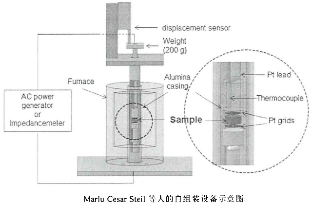 Marlu Cesar Steil等人對8mol%Y2O3-ZrO2進行閃燒實驗,使用的自組裝設備,樣品為圓柱形,最上端有一個位移傳感器(GEFRAN.PY2 Rectilinear dis-placement transducer),用來測量樣品的收縮率,精度達到10μm。考慮到通過樣品時電流的均勻性,會在樣品表面加上Pt的涂層,再將Pt網格制成的集電器輕賦于片上。這些網格可以承受較高的電流,通過直徑1mm的Pt線連接到發電機上。熱電偶放置在距柱狀樣品約1mm的位置,在每個實驗開始之前,樣品溫度保持恒定。