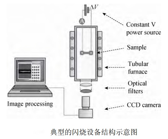 現在所說的閃燒是一個新的燒結概念,第一篇文獻于2010年由Cologna等報道,在此文及其后續的研究論文中,作者描述了一個典型的閃燒實驗平臺。利用這一平臺,Cologna將氧化鋯陶瓷坯體通過兩根鉑絲懸吊在立式管式爐的熱區處,鉑絲將樣品與電源連成回路。通過在850℃的爐內溫度下對樣品兩端加大于40V/cm的電場,使樣品因焦耳熱效應迅速升溫,同時發出亮光形成“flash”過程,在幾秒鐘之內完成致密化。