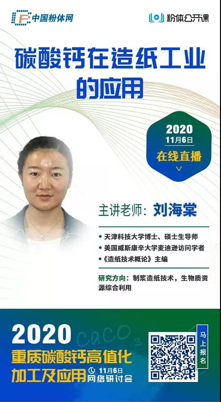 2020年11月6日,中國粉體網旗下粉體公開課平臺將舉辦首屆“重質碳酸鈣高值化加工及應用網絡研討會”,屆時來自天津科技大學的劉海棠博士將作《碳酸鈣在造紙工業中的應用》報告,詳細介紹碳酸鈣在造紙工業中的具體應用。