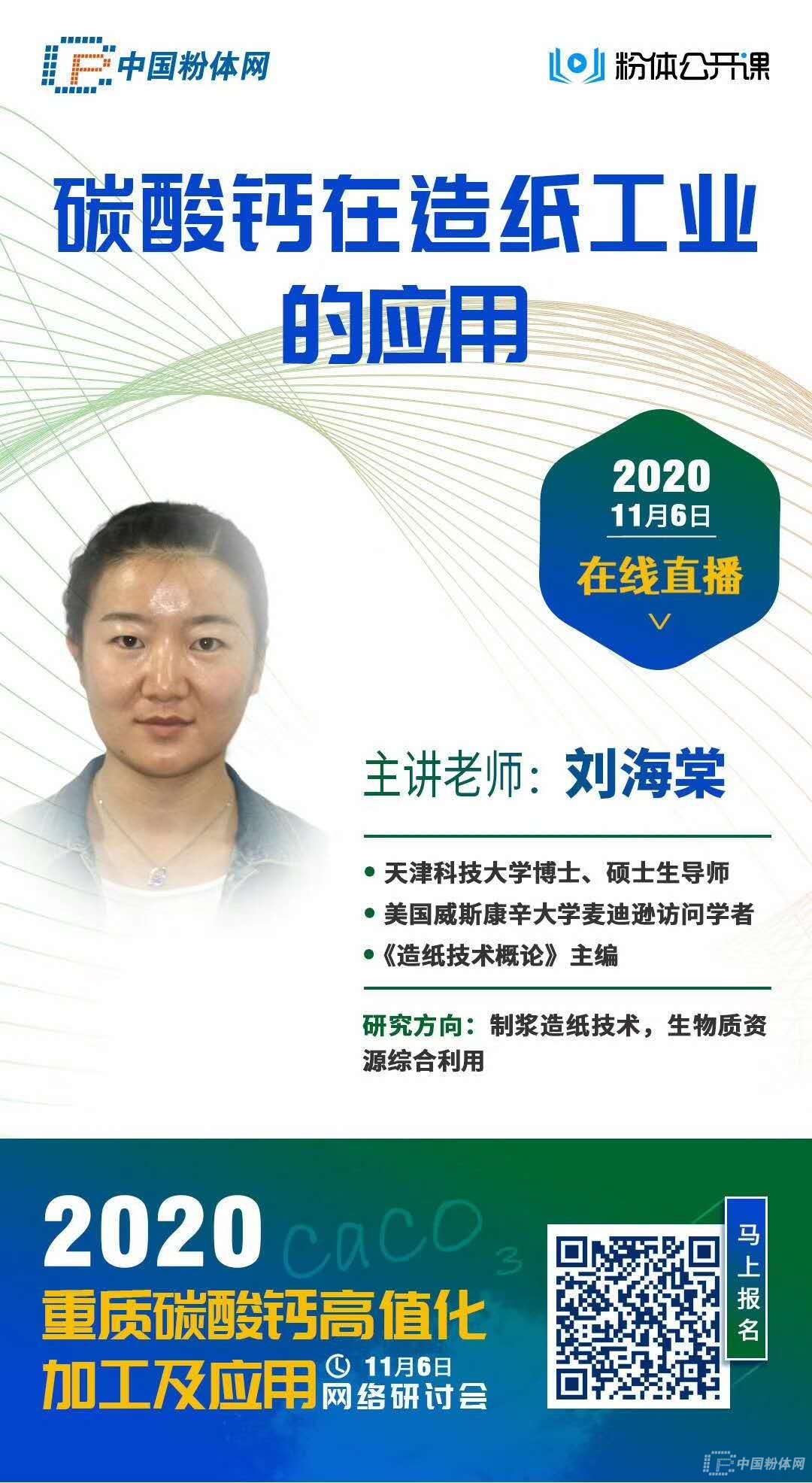 2020年11月6日,中國粉體網旗下粉體公開課平臺將舉辦首屆“重質碳酸鈣高值化加工及應用網絡研討會”,屆時來自天津科技大學的劉海棠博士將作《碳酸鈣在造紙工業中的應用》報告,詳細介紹碳酸鈣在造紙工業中的具體應用。