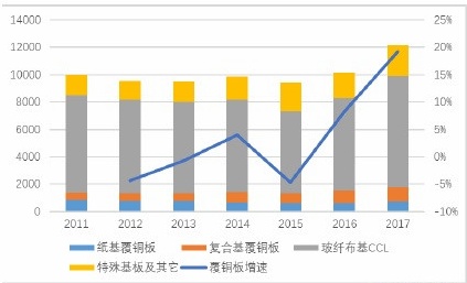 覆銅板作為PCB上游,產能也在不斷向中國集中。2017年我國剛性覆銅板產量為4.46億平方米,全球占比71.36%;產值達80.37億美元,全球占比66.21%。我國已經成為全球覆銅板的最大市場,具有絕對領先優勢。但是我國覆銅板產能仍集中于中低端產品,高端技術類覆銅板產能尚未形成,高性能覆銅板仍然需要大量進口。