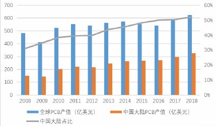 據悉,全球PCB產能不斷向中國轉移,2018年全球PCB產值約624億美元,同比增長6.1%,中國大陸PCB產值為326億美元,同比增長9.8%,自2008年以來中國大陸占全球PCB產值的比重不斷增加,目前已經達到52%。