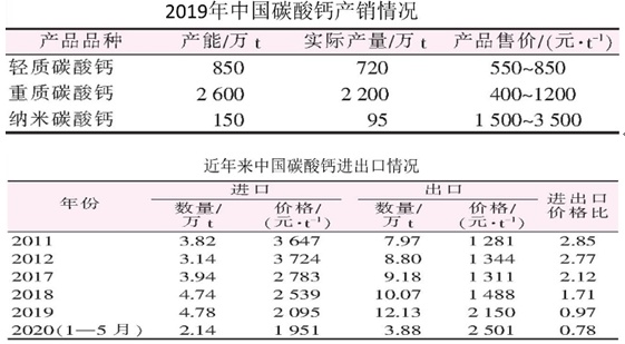 由表看出,近年來中國碳酸鈣進口量基本維持在3萬~5萬t/a,而出口量卻穩步提升,由2011年的7.97萬t升高到2019年的12.13萬t。同時出口價格逐步提高,進出口價格比由2011年的2.85穩步下降至2020年的0.78。以2019年為臨界點,出口價格超越進口價格,表明中國碳酸鈣產品質量、附加值和價格正在日益得到國際市場的認可,逐步走出低端鎖定,從一個側面反映出中國正在穩步邁向碳酸鈣生產強國。