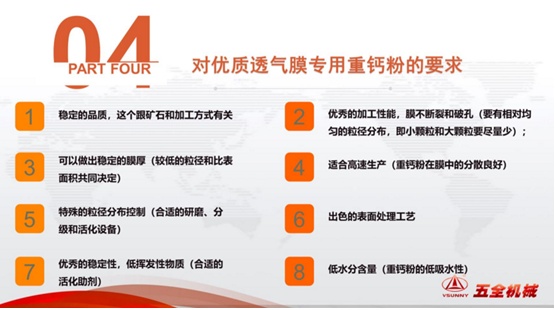 聚烯烴透氣膜是一種高分子防水透氣材料,多用于衛(wèi)生巾、尿不濕以及防護(hù)服等產(chǎn)品中。據(jù)預(yù)測(cè),全球透氣膜市場(chǎng)2016~2024年期間的年復(fù)合增長(zhǎng)率將保持在8.5%以上,至2024年預(yù)計(jì)全球透氣膜市場(chǎng)將達(dá)到400億美元左右。來自東莞市五全機(jī)械有限公司的陳睿升銷售總監(jiān)詳述了聚烯烴透氣膜、透氣膜重鈣粉干法研磨生產(chǎn)工藝、對(duì)優(yōu)質(zhì)透氣膜專用重鈣粉的要求、以及PE透氣膜母粒專用重鈣粉的參數(shù)指標(biāo)。