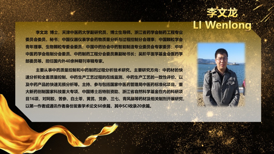 李文龍博士2011年畢業于浙江大學,獲藥物分析學博士學位,Duquesne University工業藥劑學博士后。現任天津中醫藥大學副研究員,博士生導師。中國儀器儀表學會藥物質量分析與過程控制分會理事;中國顆粒學會青年理事、生物顆粒專委會委員;中國中醫藥信息研究會藥食同源分會理事;中國中藥協會中藥智能制造專業委員會專家委員;參茸標準化技術委員會(遼寧)專家委員;中華中醫藥學會炮制分會委員、中藥制藥工程分會委員兼副秘書長;吳階平醫學基金會醫藥學部委員等。擔任《醫藥導報》、《中國藥物經濟學》、《中國實驗方劑學雜志》等5種期刊編委及《藥學學報》、《中國中藥雜志》、《藥物分析雜志》、《中草藥》、Journal of Separation Science, Journal of Pharmaceutical and Biomedical Analysis, Journal of Agricultural and Food Chemistry等國內外40余種期刊審稿專家。主要從事中藥質量控制和中藥制藥過程分析技術研究,主持、參與重大新藥創制國家科技重大專項、國家中醫藥管理局中醫藥標準化項目、國家自然科學基金、中國博士后特別資助、浙江省自然科學基金在內的科研項目16項,以第一作者或通訊作者身份發表學術論文60余篇,其中SCI收錄20余篇,影響因子大于7.0論文2篇。