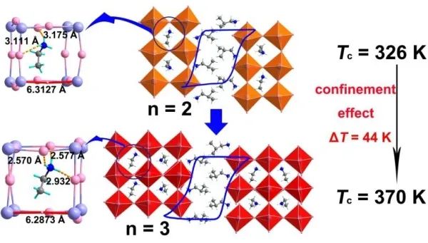 對于有機無機雜化鈣鈦礦鐵電體,有機陽離子的有序-無序運動是驅動鐵電相變的關鍵因素,提高這種旋轉驅動的雜化鈣鈦礦鐵電的相變勢壘可以顯著提高其居里溫度。有機金屬框架材料中的客體分子限域效應為合理調控二維雜化鈣鈦礦鐵電體的居里溫度提供了新思路。