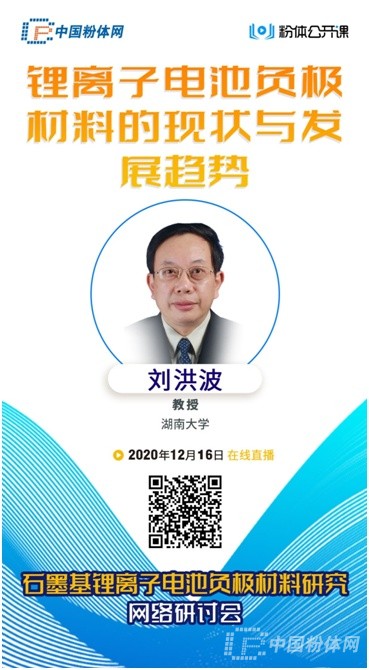 12月16日,中國粉體網旗下的粉體公開課直播平臺,將邀請劉洪波教授做報告,屆時將會與大家共同探討鋰離子電池負極材料的分類及性能特點,重點對碳石墨負極的研究與生產現狀、面臨的挑戰與機遇、鋰離子電池負極材料的發展趨勢進行分析,同時介紹團隊在鋰離子電池負極材料方面的研究成果。