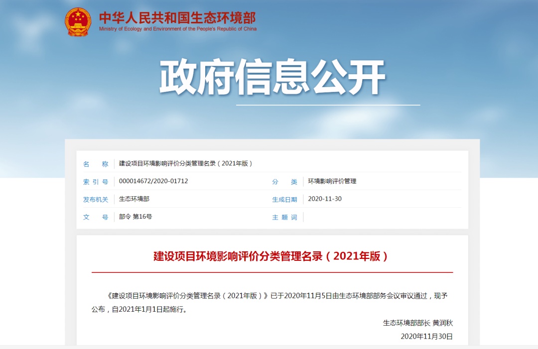 中國粉體網(wǎng)訊  日前,生態(tài)環(huán)境部發(fā)布了第16號部令--建設(shè)項目環(huán)境影響評價分類管理名錄(2021年版),該管理名錄自2021年1月1日起施行。