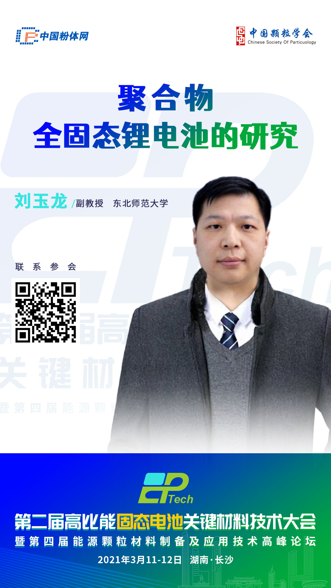 2021年3月11-12日,由中國粉體網(wǎng)、中國顆粒學(xué)會(huì)能源顆粒材料專委會(huì)主辦,長(zhǎng)沙礦冶研究院先進(jìn)材料研究所協(xié)辦的第二屆高比能固態(tài)電池關(guān)鍵材料技術(shù)大會(huì)將在長(zhǎng)沙吉美國際會(huì)展酒店隆重舉行,屆時(shí),劉玉龍教授將帶來報(bào)告《聚合物全固態(tài)鋰電池的研究》,與參會(huì)嘉賓分享相關(guān)研究成果。