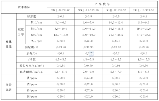 產品代號由產品名稱、等級代號、中位徑(D50)、固定碳含量和振實密度等依次排列組成,即SG-等級代號-D50-固定碳含量-振實密度,具體示例見表2.