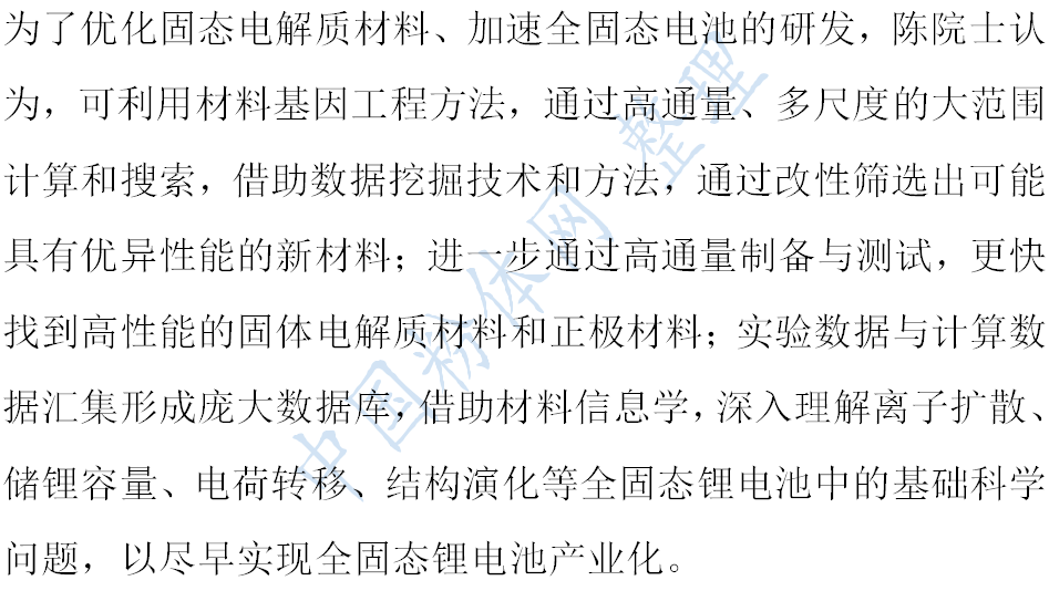 陳院士指出,尋找新的固體電解質(zhì)材料和正極材料對于我們爭奪戰(zhàn)略制高點(diǎn)是十分重要的,并提出通過“材料基因組工程”來加快這一進(jìn)程。
