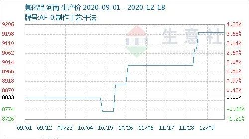 上游螢石價格走勢上漲,氫氟酸價格穩中小漲,部分氟化鋁企業推漲出廠價格。據生意社數據顯示,12月18日國內氟化鋁價格為9166元/噸,較周初氟化鋁價格持平。