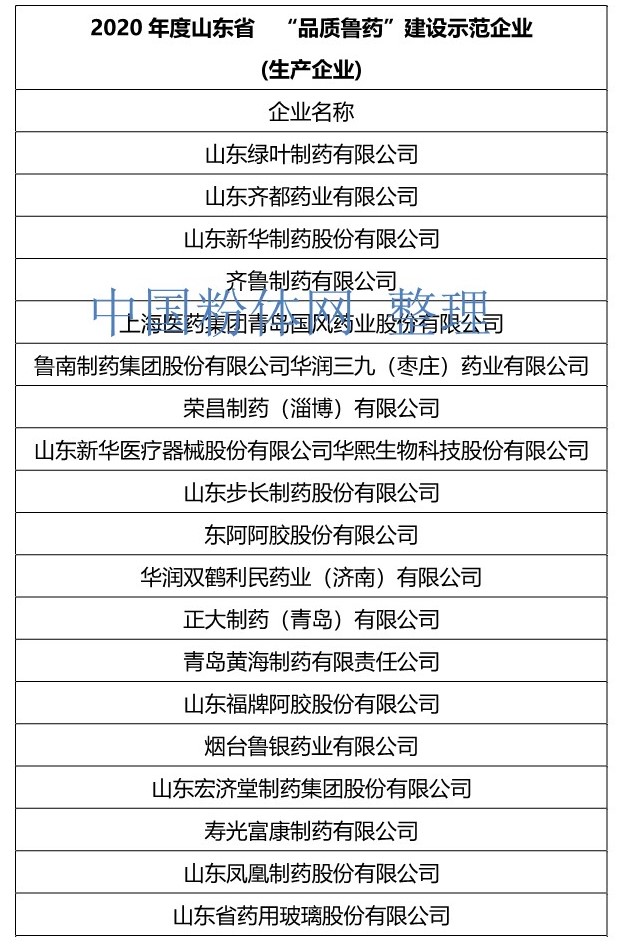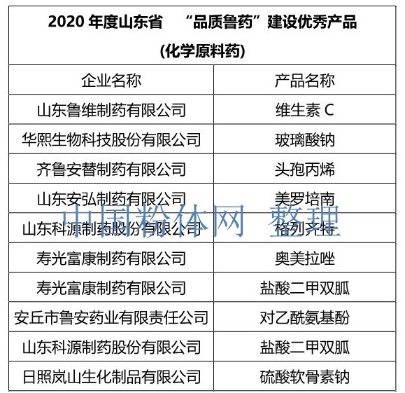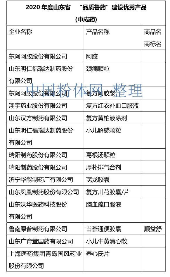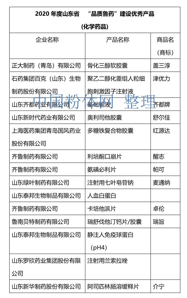 中國粉體網(wǎng)訊 近日,山東省醫(yī)藥行業(yè)協(xié)會組織開展2020年度山東省“品質(zhì)魯藥”品牌建設(shè)發(fā)布活動,會上發(fā)布2020年度山東省“品質(zhì)魯藥”品牌建設(shè)示范企業(yè)36個和優(yōu)秀產(chǎn)品106個,并現(xiàn)場進行頒獎儀式。