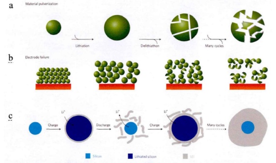 (a.硅顆粒粉碎化;b.電極失效;c.不穩(wěn)定的固體電解質(zhì)層)
