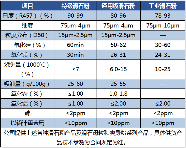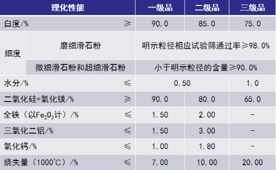 涂料-油漆用、造紙用、塑料用、橡膠用、電纜用、陶瓷用、防水材料用、通用滑石粉產品質量符合《滑石粉》(GB/T 15342)標準。