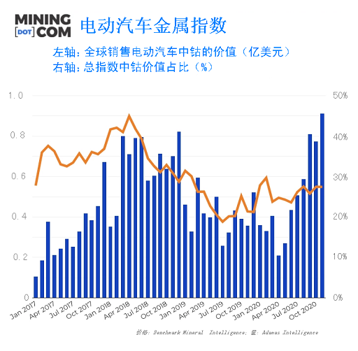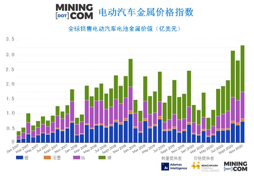 基準礦物情報(Benchmark Mineral Intelligence)價格評估顯示,11月份,構成該指數的所有四種商品價格都出現上漲,到2020年11月底,鈷價上漲了32%。