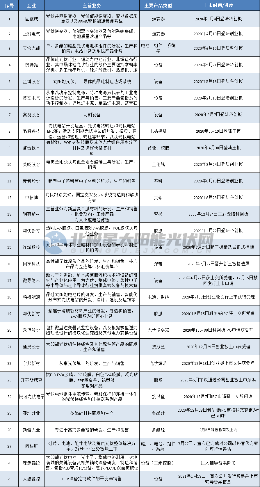 據北極星太陽能光伏網統計,從2020年初到目前為止,短短的一年時間,就有29家光伏企業沖刺IPO,其中14家企業上市成功,2家企業晉升新三板精選層,12家企業上市進行中,僅微導納米撤回發行上市申請。