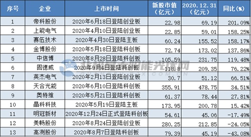經過北極星太陽能光伏網梳理發現,從各上市企業登陸資本市場開始到2020年底,表現最亮眼的當屬帝科股份,從6月18日登陸創業板到年末,市值實現2倍增長,上能電氣、賽伍技術實現1.58倍增長,金博股份實現1.37倍增長。整體來看,將近77%的企業市值實現了增長,僅明冠新材、美暢股份、高測股份市值出現回落,其中明測股份下降了約43%。