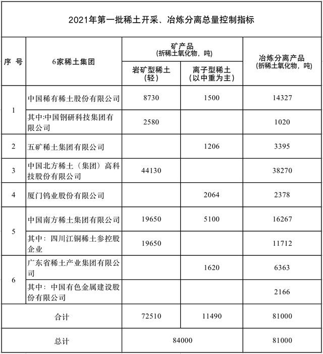 接收指標的六大稀土集團分別是中國稀有稀土股份有限公司(下稱中國稀有稀土)、五礦稀土集團、北方稀土(600111.SH)、廈門鎢業(600549.SH)、中國南方稀土集團(下稱南方稀土)和廣東稀土集團。