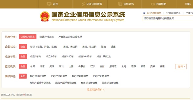 通過國家企業信用信息公示系統,并未查詢到“江蘇連云港亮晶科技有限公司”與“連云港亮晶科技有限公司”。