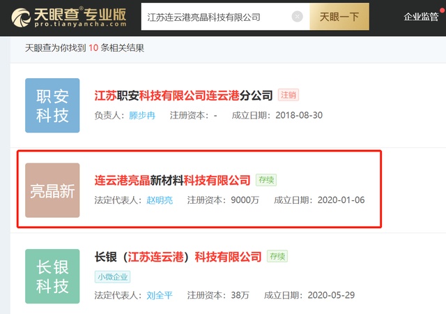 而通過天眼查搜索“江蘇連云港亮晶科技有限公司”,推薦了“連云港亮晶新材料科技有限公司”。