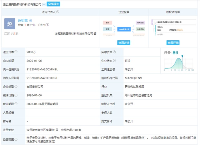 天眼查顯示,連云港亮晶新材料科技有限公司成立于2020年1月,注冊資本9000萬,經營范圍包括,電子半導體材料、光電子專用材料產品的研發、制造、銷售;礦產品研發銷售(煤炭及其制品除外)。