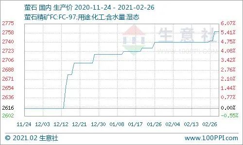 中國粉體網(wǎng)訊 據(jù)統(tǒng)計2月份國內(nèi)螢石價格走勢小幅上漲,截止月末國內(nèi)螢石均價為2761.11元/噸,較月初價格2741.11元/噸上漲0.73%,同比下滑11.57%。