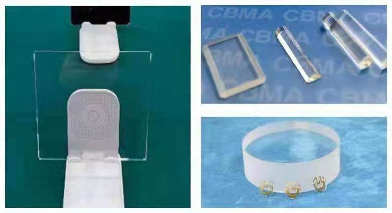 光掩膜石英玻璃(左)、耐輻照濾紫外石英玻璃(右上)、高純石英玻璃(右下)