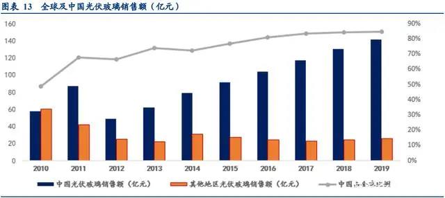 2011 年之后政策刺激帶動需求爆發,國內企業開始海外建廠。2011 年和 2012 年, 美國和歐盟分別對中國光伏行業展開“雙反”調查,國內光伏產業發展遭遇“貿易 戰”的阻礙。為應對美歐“雙反”調查的不利影響,2012 年下半年政府出臺六項鼓 勵性政策,刺激光伏產業鏈發展。政策刺激下光伏玻璃需求增長較大,2012-2013 年 國內光伏玻璃銷售額均實現 25%以上的增長。至 2016 年時,中國光伏玻璃規模已占 全球份額 80%以上,國內企業也開始在海外布局產能,信義在馬來西亞投產 900t/d 光伏玻璃產線,福萊特也在越南擴張產能。2006 年到 2016 年的十年時間,中國光 伏玻璃行業實現從依賴進口到國產替代再到替代進口的轉變。目前我國是全球最大 光伏玻璃產國,2019 年光伏玻璃銷售額 141.11 億元,全球占比 85%;光伏玻璃產量 4.66 億平米,全球占比 86%。