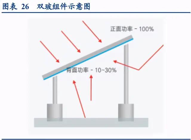 單玻組件為晶硅組件的主流產品,雙玻組件憑借發電增益優勢,滲透率有望提升。晶硅 光伏組件根據背面材質可以分為雙玻組件和單玻組件,單玻組件的背板材料大部分為不 透光的復合材料(TPT、TPE 等),目前單玻組件仍是主流,2020 年單玻組件市占率 70% 左右,雙玻組件占比 29.7%;雙玻組件采用玻璃替代了單玻組件的復材背板,雙面采用 玻璃封裝。相比單玻組件,雙玻組件的生命周期更長,耐候性和耐腐蝕性更強,衰減低于普通組件;發電效率更高,正面背面均有發電能力,背面可接受周圍環境的反射光、 散射光轉換為電能,根據不同地面環境雙面組件能夠提高 10%-30%的發電量。根據李亞 彬《360W 超高功率 n 型雙玻雙面發電組件研究及應用》,采用背面無橫梁安裝方式時,雙玻組件的發電量增益最高可以達到 32.99%,平均發電量增益約 21.38%;橫梁式安裝 方式,發電量增益最高可達 30.18%,平均發電量增益 20.10%。憑借發電量優勢,雙玻 組件未來滲透率有望提升。