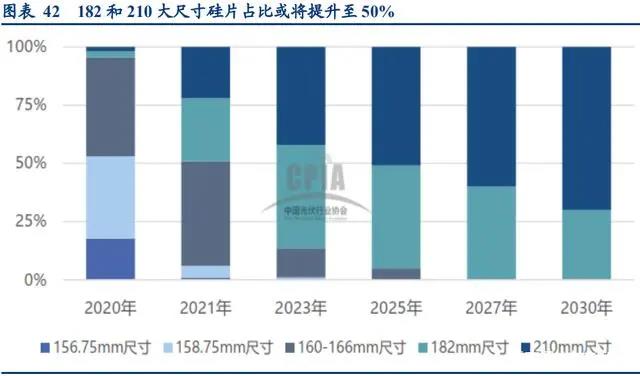 硅片大型化趨勢明顯,對于封裝玻璃提出大尺寸需求。為獲得更高組件功率以降低單位 成本,很多企業開始調整組件尺寸,硅片在原有的 156.75mm 基礎上又出現了 158.75mm, 161.75mm,166mm 等不同尺寸規格,中環則推出 210mm 尺寸 M12 硅片,同時也推出迭 代產品 M10(200*200mm)與 M9(192*192mm)。根據 CPIA 數據,2020 年市場 158.75mm 和 166mm 尺寸占比合計達到 77.8%,156.75mm 尺寸(包括 157mm)由 2019 年的主流 尺寸下降為 17.7%,預計在 2022 年左右被淘汰;2020 年 182mm 和 210mm 尺寸合計占 比約 4.5%,預計 2021 年其占比將快速擴大,或將占據一半市場份額。大尺寸電池片滲 透加速,組件尺寸隨著增大,對于封裝的光伏玻璃提出新的大尺寸需求。