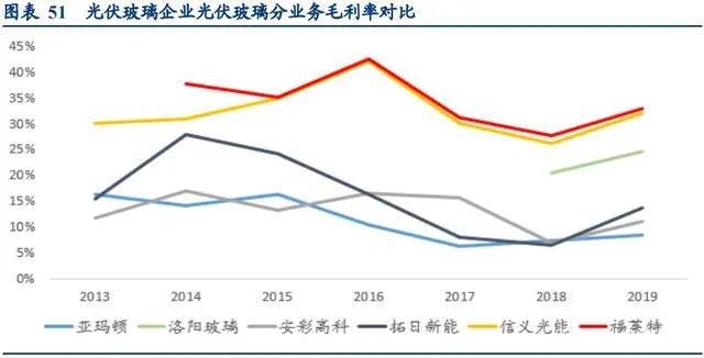 大窯爐內部溫度更穩定,成品率相比小型窯爐更高,可以實現單噸材料和燃料消耗下降、 生產效率的提升,1000t/d 生產線單位成本相較 300-600t/d 級的窯爐低 10%-20%。信義 光能和福萊特毛利率水平遠高于行業其它公司,近年基本穩定在 30%左右,二三梯隊的 光伏玻璃企業毛利率僅維持在 10%左右。從福萊特光伏玻璃業務的單位成本來看,整體 處于下降趨勢,從 2015 年接近 20 元/平方米下降至 2019 年的 16 元/平方米左右。