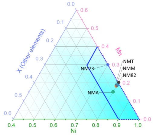 2021年2月,北京大學深研院新材料學院潘鋒教授課題組和美國阿貢國家實驗室的KhalilAmine教授、JunLu研究員深入合作,結合原位同步輻射和球差電鏡等技術以及量子化學計算,深入分析了鈷元素在NMC正極材料的主要作用和提出了全新無鈷材料組分。該合作團隊進一步提出新組分LiNiαMnβXγO2(NMX)是極具潛力的無鈷正極材料的發展方向,并驗證該系列材料優異的性能。這項研究對高性能低成本無鈷電池的發展具有重要的指導意義。
