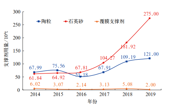 近年來隨著開采規模增大,支撐劑的銷量也在不斷增大。根據對支撐劑市場的調查,不同支撐劑的市場份額為天然石英砂占80%,陶粒支撐劑10%,覆膜樹脂砂10%,可以看出目前市面上的支撐劑還是以石英砂為主。雖然石英砂的強度不大,但成本低,資源廣泛,在多數的淺井開采中,石英砂就可以達到支撐劑的標準。