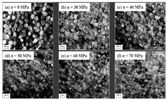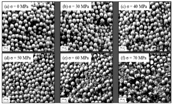 而涂利輝等在石英砂與陶粒物理特性的分析中,以工區使用的20~40目石英砂抗壓強度28MPa,20~40目陶粒抗壓強度52MPa為試驗,目的層閉合壓力在45~55MPa。通過室內實驗表明石英砂破碎率遠大于陶粒,石英砂在閉合壓力50MPa時破碎率高達25%;而陶粒在50MPa閉合壓力下,仍然保持較完整形態,破碎率<5%。