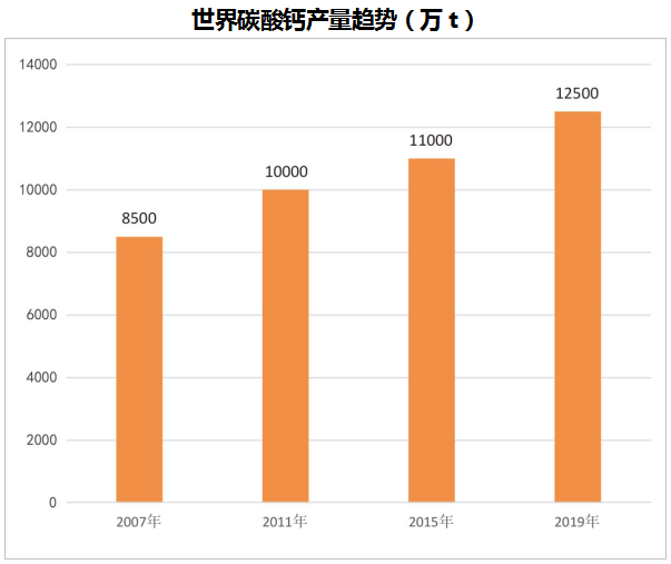 中國粉體網訊 由于造紙、涂料、塑料、橡膠等材料工業的快速發展,市場對重質碳酸鈣、輕質(納米)碳酸鈣等碳酸鈣產品需求量越來越大。世界碳酸鈣的生產能力在過去10年以年均增長率5%-8%的速度增長。據統計,2011年,世界碳酸鈣產量約1億t,其中重質碳酸鈣超過8000萬t,輕質碳酸鈣超過1700 萬t;2015年世界碳酸鈣產量超1.1億t,其中重質碳酸鈣可達9000萬t,而中國重質碳酸鈣約為1500萬t;2019年全球碳酸鈣產量達到1.2億t以上。