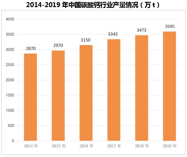 我國碳酸鈣產業經歷了不斷進步和成長的幾個階段,逐步發展成為世界碳酸鈣產業大國,特別是近十余年一直保持世界碳酸鈣生產和消費的第一大國地位。碳酸鈣產量約占世界總產量的30%左右。據統計,2019年我國碳酸鈣行業產量3595萬噸。