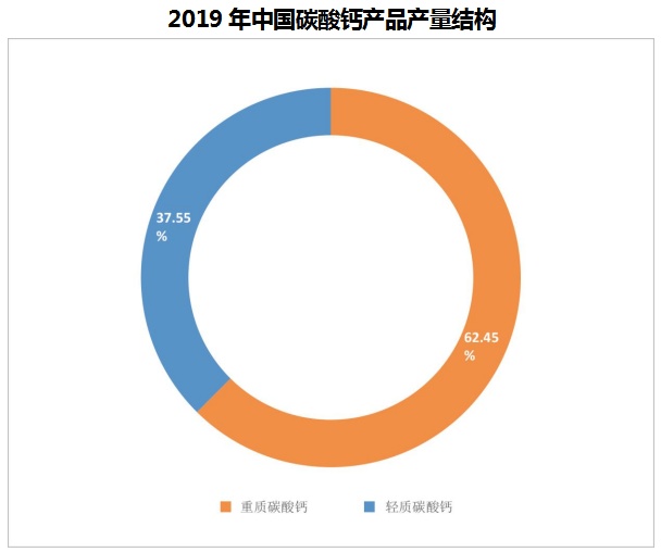 整體而言,國內目前以重質碳酸鈣為主。2019年我國輕質碳酸鈣產量1350萬噸,而重質碳酸鈣產量2245萬噸,產量占比為37.55%、62.45%。