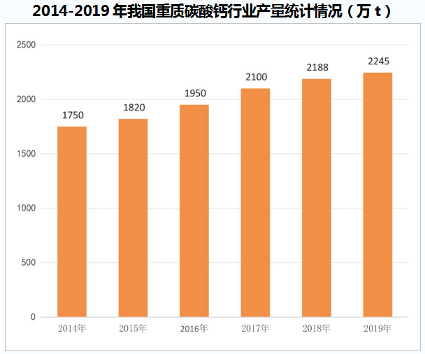 得益于造紙行業重質碳酸鈣用量的持續大幅增加,以及塑料行業、橡膠行業、涂料行業以及建筑材料等的快速發展,我國重質碳酸鈣生產經營不斷集中、生產能力不斷提高,其產量、產值也持續增長。產量由2014年的1750萬噸增長至2019年的2245萬噸。
