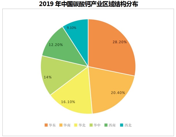 據統計分析,2019年碳酸鈣產業主要集聚在華東、華南、華北,分別占據全國的28.2%、20.4%、16.1%。