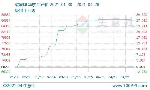 根據生意社價格監測,2021年4月碳酸鋰華東市場價格一直保持平穩運行的趨勢。截止4月28日工業級碳酸鋰華東地區均價價格為86600元/噸,與月初(4月1日工碳華東地區均價價格為87000元/噸)均價相比價格下降了0.46%。而4月28日電池級碳酸鋰華東地區均價價格為90000元/噸,與月初(4月1日電碳華東地區均價價格為90600元/噸)均價相比價格下降了0.66%。直至28日工業級碳酸鋰綜合價格處于8.0-9.0萬元/噸,電池級碳酸鋰綜合價格處于8.5-9.2萬元/噸。