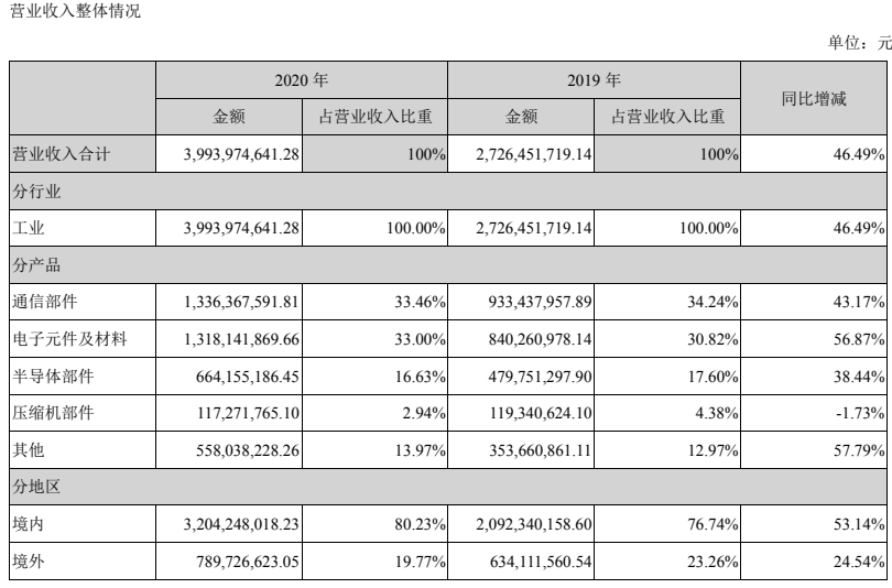 2020年度受益于5G技術(shù)加速普及與國(guó)產(chǎn)替代進(jìn)程不斷深化,疊加汽車(chē)電子化、智能制造產(chǎn)業(yè)不斷擴(kuò)大的影響,消費(fèi)電子需求帶動(dòng)被動(dòng)元器件景氣度上升,市場(chǎng)供不應(yīng)求,供應(yīng)鏈安全形勢(shì)迫使國(guó)產(chǎn)替代加速,公司產(chǎn)品銷(xiāo)售相應(yīng)增長(zhǎng)。報(bào)告期內(nèi),公司抓住市場(chǎng)機(jī)遇,提前進(jìn)行戰(zhàn)略部署,2020年10月份募集18.74億元用于“5G通信用高品質(zhì)多層片式陶瓷電容器擴(kuò)產(chǎn)技術(shù)改造項(xiàng)目”的投資建設(shè),擴(kuò)大產(chǎn)品產(chǎn)能,滿(mǎn)足市場(chǎng)需求。報(bào)告期內(nèi),電子元件及材料銷(xiāo)售額增長(zhǎng)56.87%。