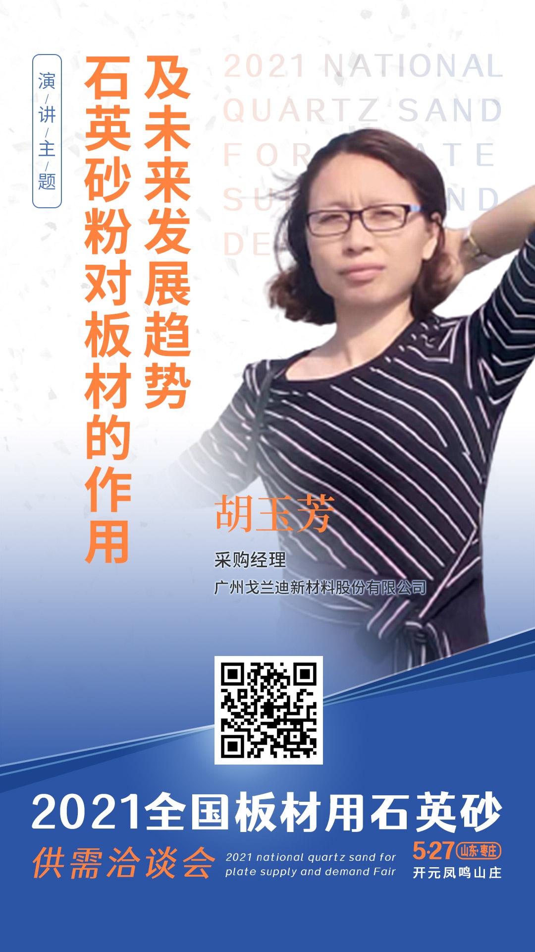 2021年5月27日,中國粉體網將在山東棗莊舉辦“2021全國板材用石英砂供需洽談會”,屆時,廣州戈蘭迪新材料股份有限公司采購經理胡玉芳將作《石英砂粉對板材的作用及未來發展趨勢》報告,重點闡述石英在石英石板材中的應用、對石英石板材的影響以及常見質量問題以及石英石板材的應用與發展趨勢等。