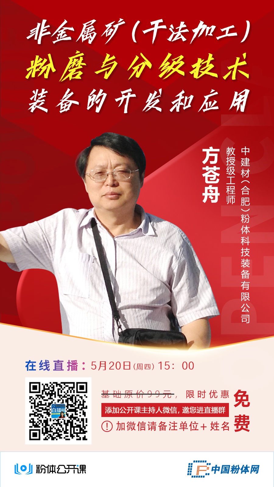 盡管我國非金屬礦工業(yè)已經(jīng)取得一定發(fā)展,但不得不承認(rèn),行業(yè)內(nèi)存在的“窮”、“小”、“散”、“粗”的局面沒有得到改變,出現(xiàn)企業(yè)生產(chǎn)粗放管理、加工和技術(shù)水平落后的情況。因此,產(chǎn)業(yè)結(jié)構(gòu)調(diào)整,轉(zhuǎn)型升級(jí)改造迫在眉睫,裝備水平的提升成為非金屬礦行業(yè)實(shí)現(xiàn)經(jīng)濟(jì)效益和長遠(yuǎn)發(fā)展的重要前提和保證。為此,中國粉體網(wǎng)旗下平臺(tái)粉體公開課邀請(qǐng)到合肥水泥研究設(shè)計(jì)院、中建材(合肥)粉體科技裝備有限公司教授級(jí)工程師方蒼舟做客直播間作《非金屬礦(干法加工)粉磨與分級(jí)技術(shù)裝備的開發(fā)和應(yīng)用》的報(bào)告。他將從非金屬礦的物理性能、干法加工特點(diǎn)講述,著重講解非金屬礦干法加工的常用設(shè)備、主流設(shè)備的研發(fā)和應(yīng)用;從分級(jí)設(shè)備的特點(diǎn)、種類和適用范圍等內(nèi)容對(duì)非金屬礦用粉磨分級(jí)設(shè)備進(jìn)行專業(yè)講解并對(duì)存在問題進(jìn)行解答。2021年5月20日下午3:00,我們相約中國粉體網(wǎng)粉體公開課!