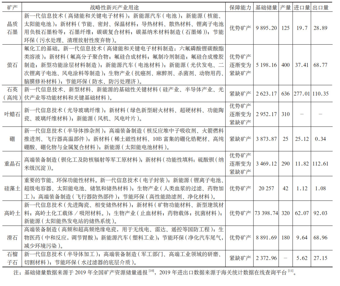 10種戰(zhàn)略性非金屬礦產(chǎn)的重要性和2019年資源及貿(mào)易情況(單位:萬t)