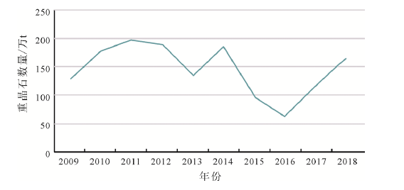 美國(guó)近十年從中國(guó)進(jìn)口重晶石數(shù)量變化圖