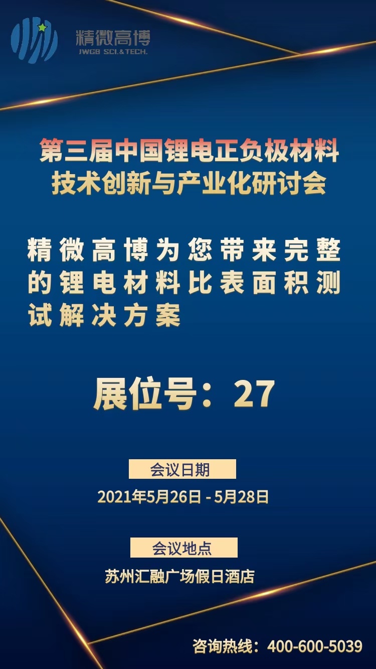 第三屆(2021)中國鋰電正負極材料技術創新與應用化研討會,將于2021年5月26日-5月28日在江蘇·蘇州匯融廣場假日酒店舉行。北京精微高博科學技術有限公司作為協辦單位參加此次研討會,與國內外正負極材料產業鏈相關的專家學者、工程技術人員等共聚一堂,充分交流、集思廣益、相互切磋,以期實質性促進我國正負極材料的進一步發展。