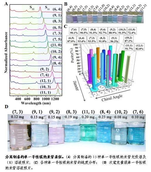 在國家重點研發(fā)計劃“變革性技術(shù)關(guān)鍵科學(xué)問題”重點專項的支持下,中國科學(xué)院物理研究所/北京凝聚態(tài)物理國家研究中心劉華平團隊在前期碳納米管手性結(jié)構(gòu)分離制備研究的基礎(chǔ)上,發(fā)展了高精度凝膠色譜技術(shù),突破了具有小手性角的近鋸齒型單一手性碳納米管的宏量制備瓶頸,分離制備出11種手性角小于20°的單一手性碳納米管,其中7種近鋸齒型單一手性碳納米管的分離產(chǎn)量達到了次毫克量級。所分離的碳納米管通過共價修飾能夠?qū)崿F(xiàn)通信波段單一的光子能量發(fā)射,在單光子發(fā)射器件方面表現(xiàn)出很好的應(yīng)用前景。該成果進一步提高了我國在單一手性碳納米管制備方面的能力,也為系統(tǒng)探測和調(diào)控碳納米管的物理性質(zhì)及其在信息電子、光電子、生物成像等領(lǐng)域的應(yīng)用提供了材料基礎(chǔ)。