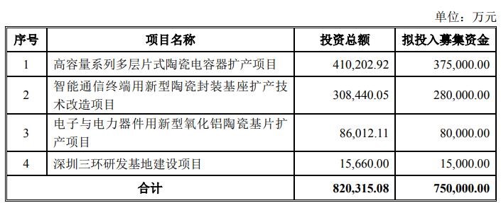 5月11日,潮州三環(huán)集團發(fā)布2021年度向特定對象發(fā)行股票預(yù)案公告,擬向特定對象發(fā)行募集資金總額不超過 75億元(含發(fā)行費用),其中,高容量系列多層片式陶瓷電容器擴產(chǎn)項目擬投入募集資金37.5億元,智能通信終端用新型陶瓷封裝基座擴產(chǎn)技術(shù)改造項目擬投入募集資金28億元,電子與電力器件用新型氧化鋁陶瓷基片擴產(chǎn)項目擬投入募集資金8億元,深圳三環(huán)研發(fā)基地建設(shè)項目擬投入募集資金1.5億元。