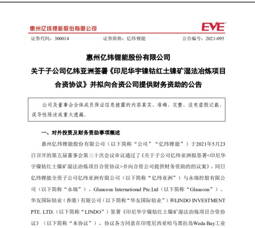 中國粉體網訊 5月24日,億緯鋰能(300014.SZ)發布公告稱,公司全資子公司億緯亞洲與永瑞、Glaucous、華友國際鈷業、LINDO簽署《印尼華宇鎳鈷紅土鎳礦濕法冶煉項目合資協議》。